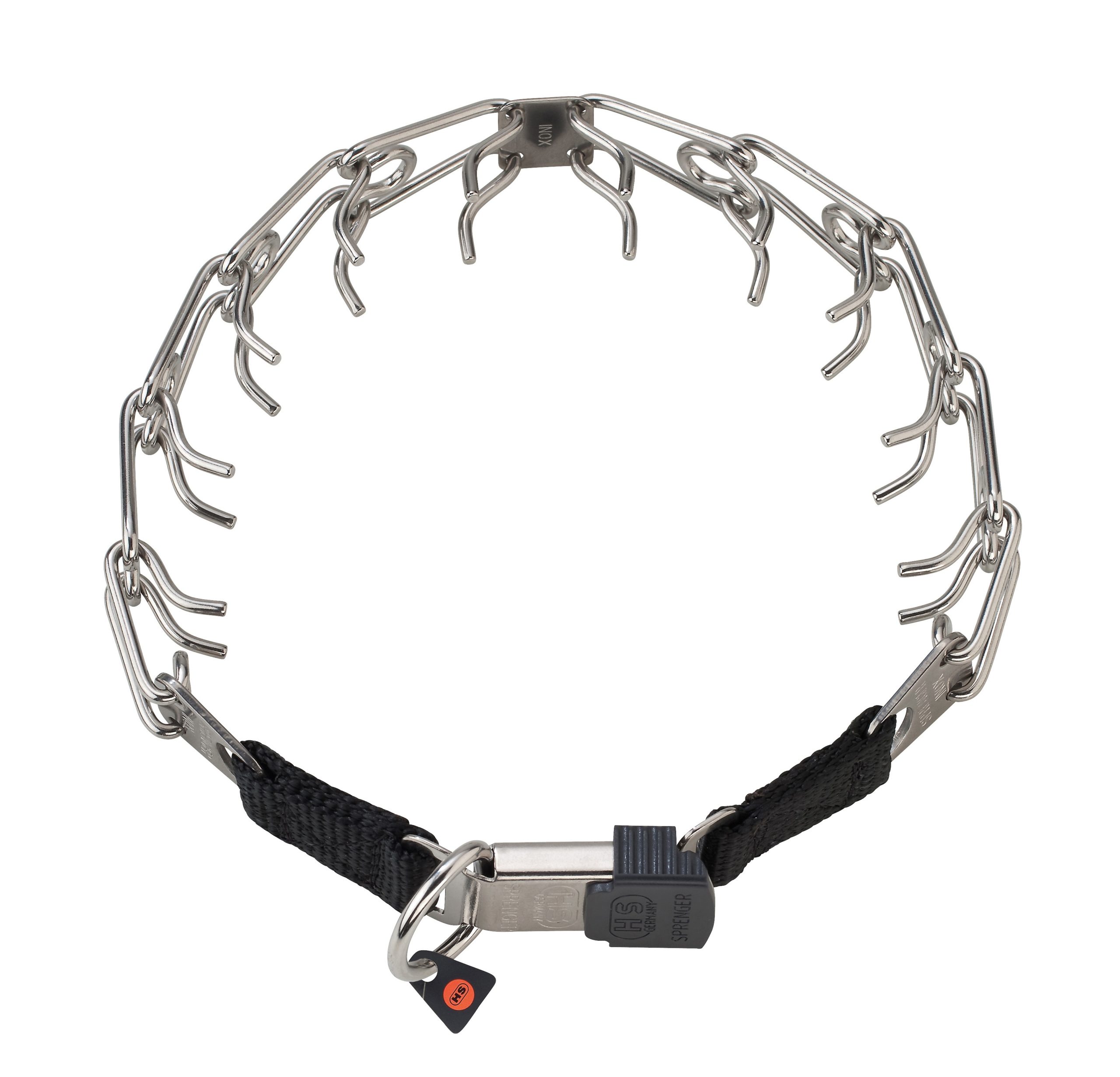 Diferenta dintre zgarzile Sprenger si o mare parte din celelalte produse de pe piata este ca acestea au varfurile slefuite rotund din fabricatie, pentru a nu rani pielea cainelui. Alte produse de pe piata se comercializeaza cu margini neslefuite, ce provoaca numeroase rani cainilor. Foarte multi posesori de caini evita sa foloseasca zgarzile pentru dresaj din cauza faptului ca se pun dificil la gatul cainelui. De aceea, ori se pun peste capul acestuia, modalitate periculoasa si ce presupune o zgarda prea larga pentru a fi eficienta in corectie, ori se pun prin desfacerea unei zale, lucru de asemenea incomod si greu. Hermann Sprenger a conceput o serie de zgarzi pentru dresaj ce se prind rapid si usor, fara a stresa inutil cainele. Din aceasta serie cea mai facil de utilizat este "zgarda pentru dresaj cu catarama rapida". Material: otel inoxidabil Lungime: 52 cm Diametru fir metalic: 3.2 mm Lungime za: 4 cm Rezistenta la rupere: 150 kg. Reglaj lungime: Acestui produs i se poate modifica lungimea prin adaugarea sau eliminarea de zale Recomandare: Pentru rase de caini de talie medie si mare. Fabricat in Germania. Zgarda nu poate fi pusa invers la gatul cainelui din cauza sistemului de prindere ClicLock.